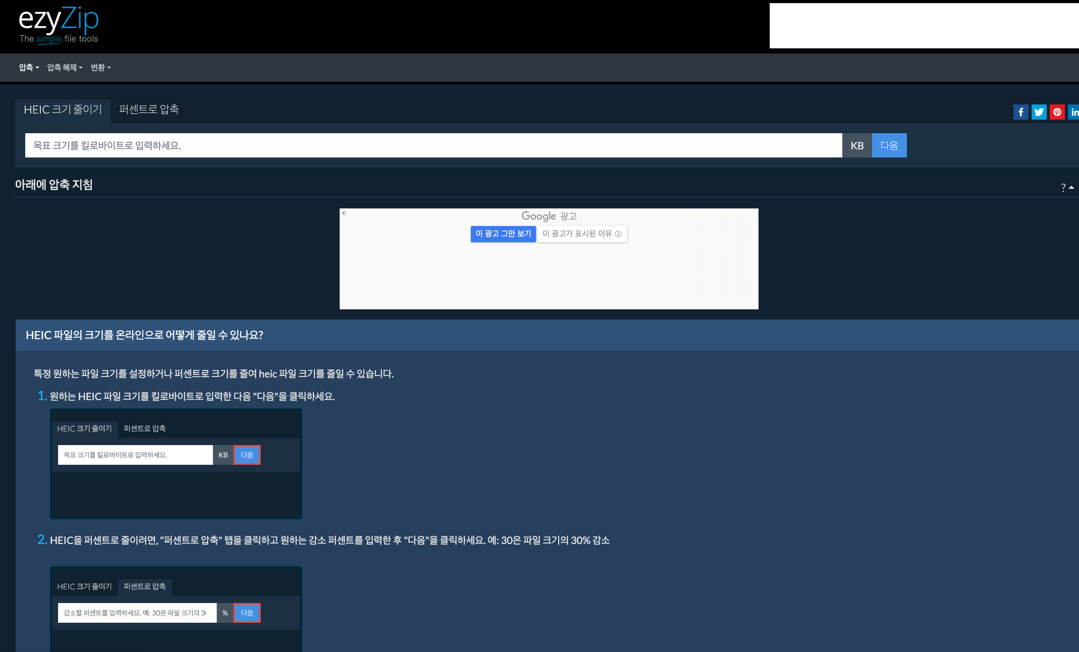 두 번째로 소개해 드리는 방법은 “ezyzip”홈페이지의 용량 줄이는 기능을 이용하시는 방법입니다.