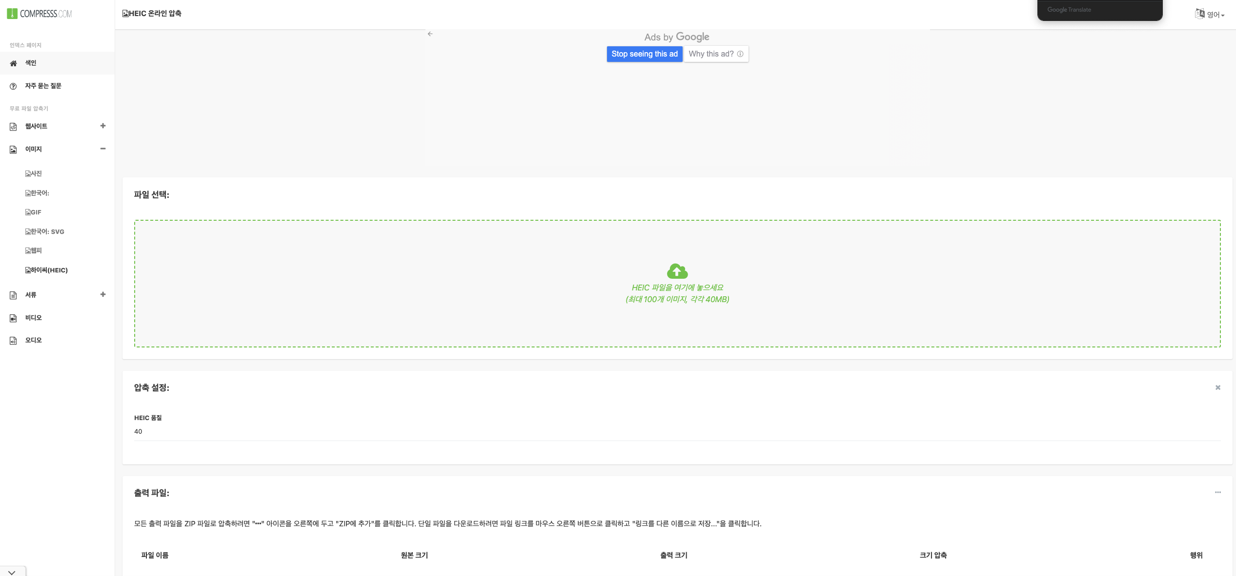 마찬가지로 홈페이지에 접속하여 Heic 품질(1~100/높을수록 고화질)을 입력하시고 용량을 줄이고자 하는 파일을 업로드 해주시면 자동으로 작업이 진행됩니다.