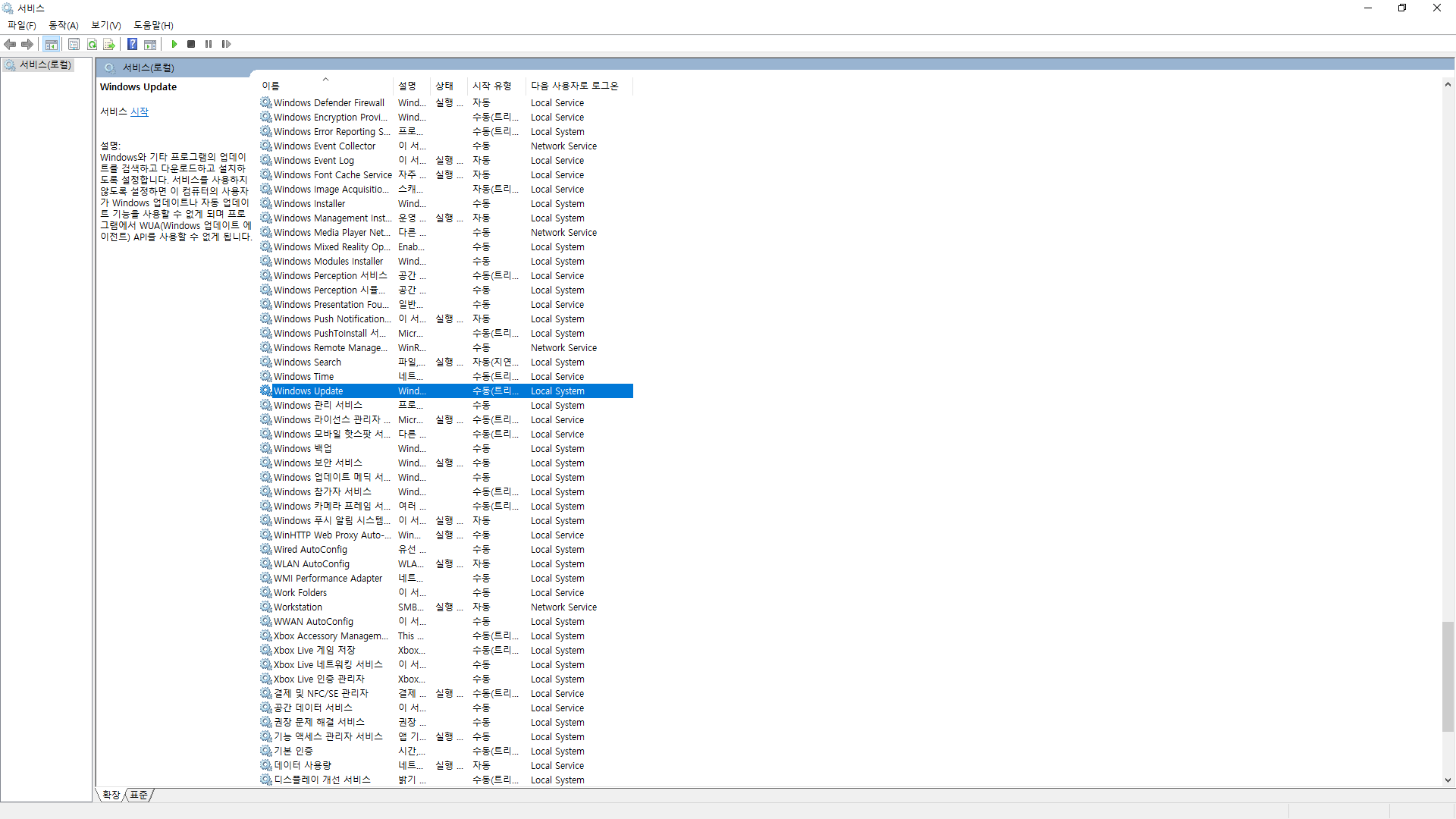 서비스 관리 도구에서 Window 업데이트 또는 Window update 항목을 찾아 클릭 합니다.