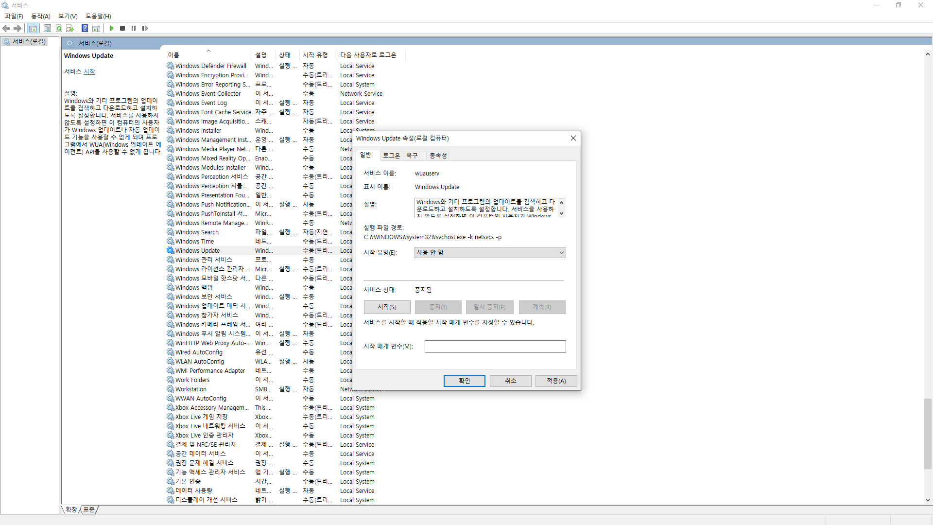 윈도우의 서비스 관리 도구를 활용하여 업데이트 기능 자체를 끄실 수 있습니다.