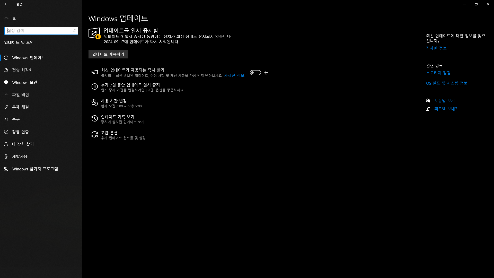 PC 윈도우 설정에서 업데이트를 일시 중지하는 방법입니다.