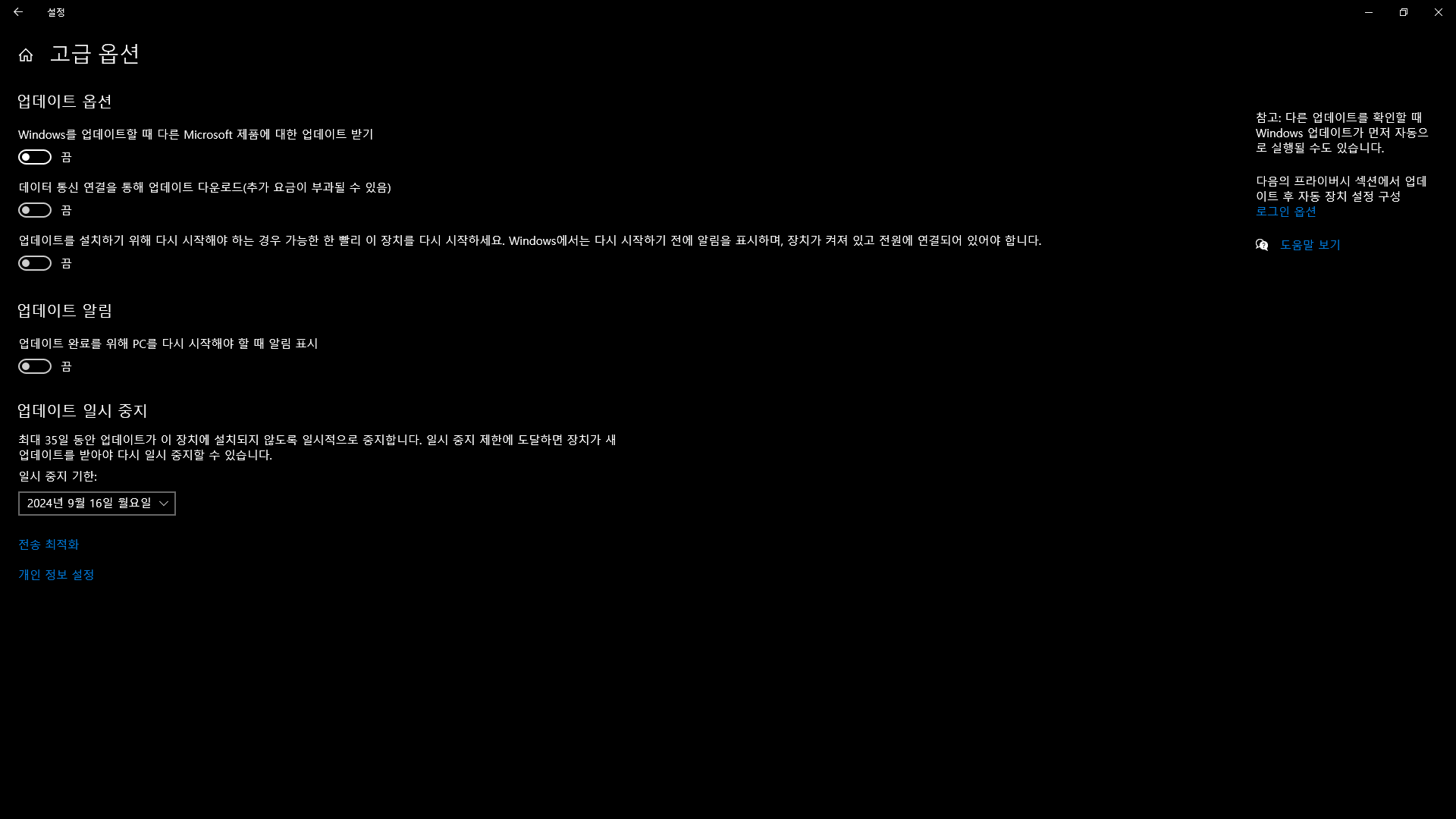 이후 “고급 옵션” 을 클릭하여 주시고, 업데이트 일시 중지의 기한을 원하는 일정에 맞춰 설정 해주시면 끝 입니다.