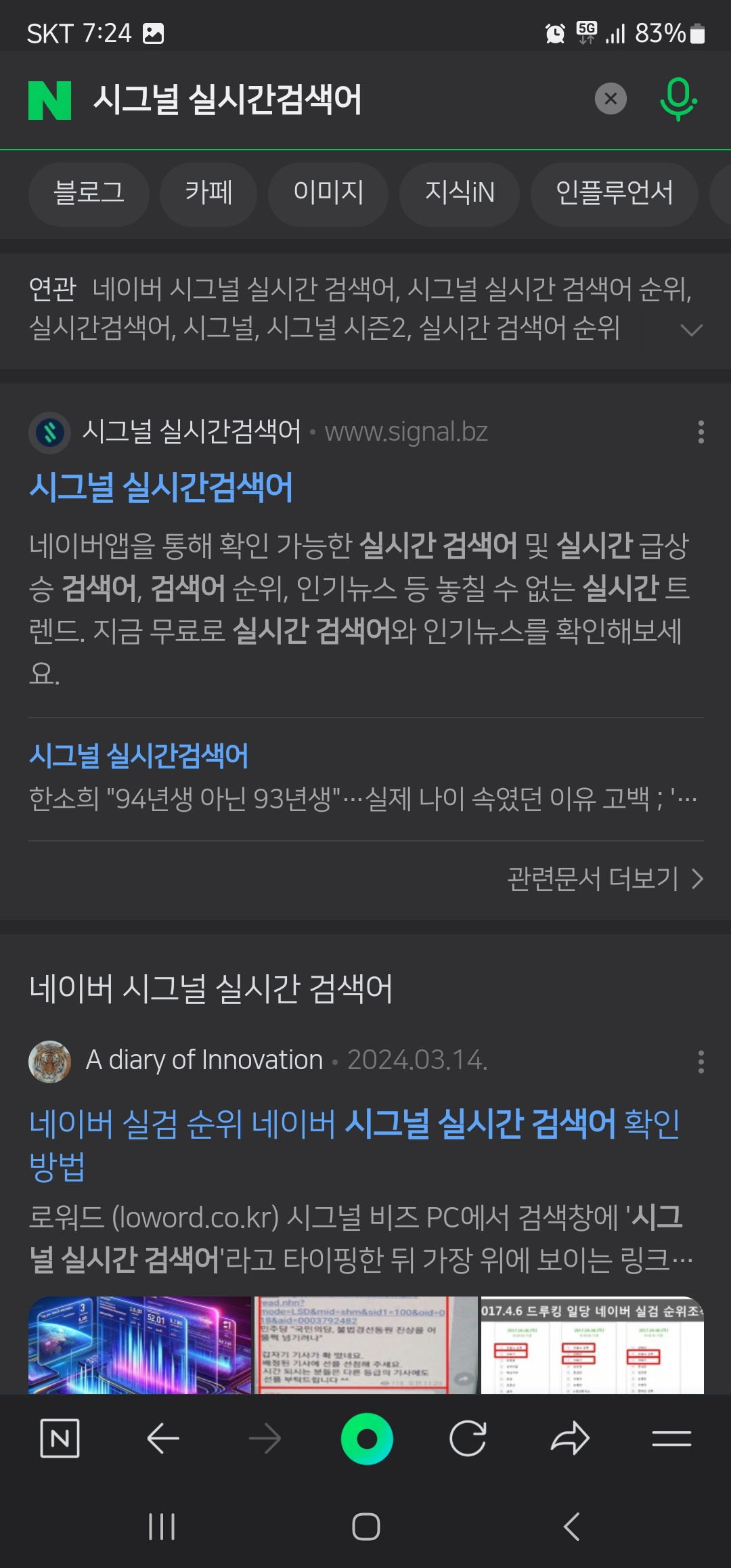 2. 네이버 앱 실행 후 검색창에 “시그널 실시간 검색어”를 입력 후 홈페이지에 접속합니다.