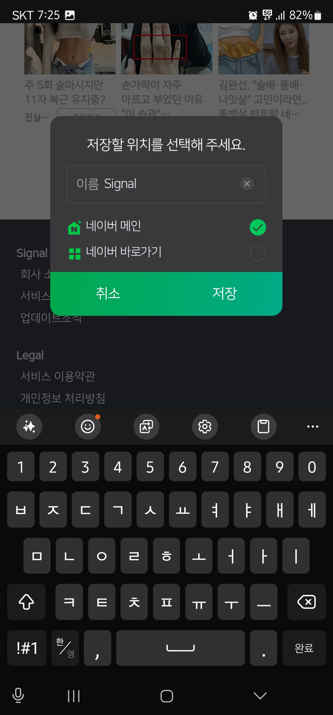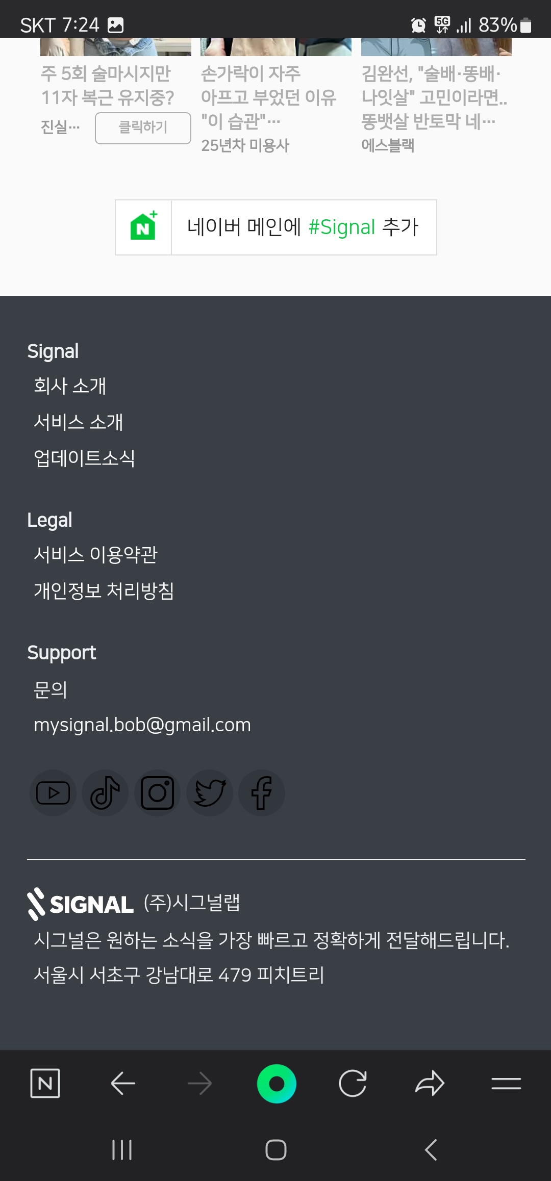 1. 가장 하단으로 드래그하여 “네이버 메인에 #Signal 추가”를 클릭합니다.