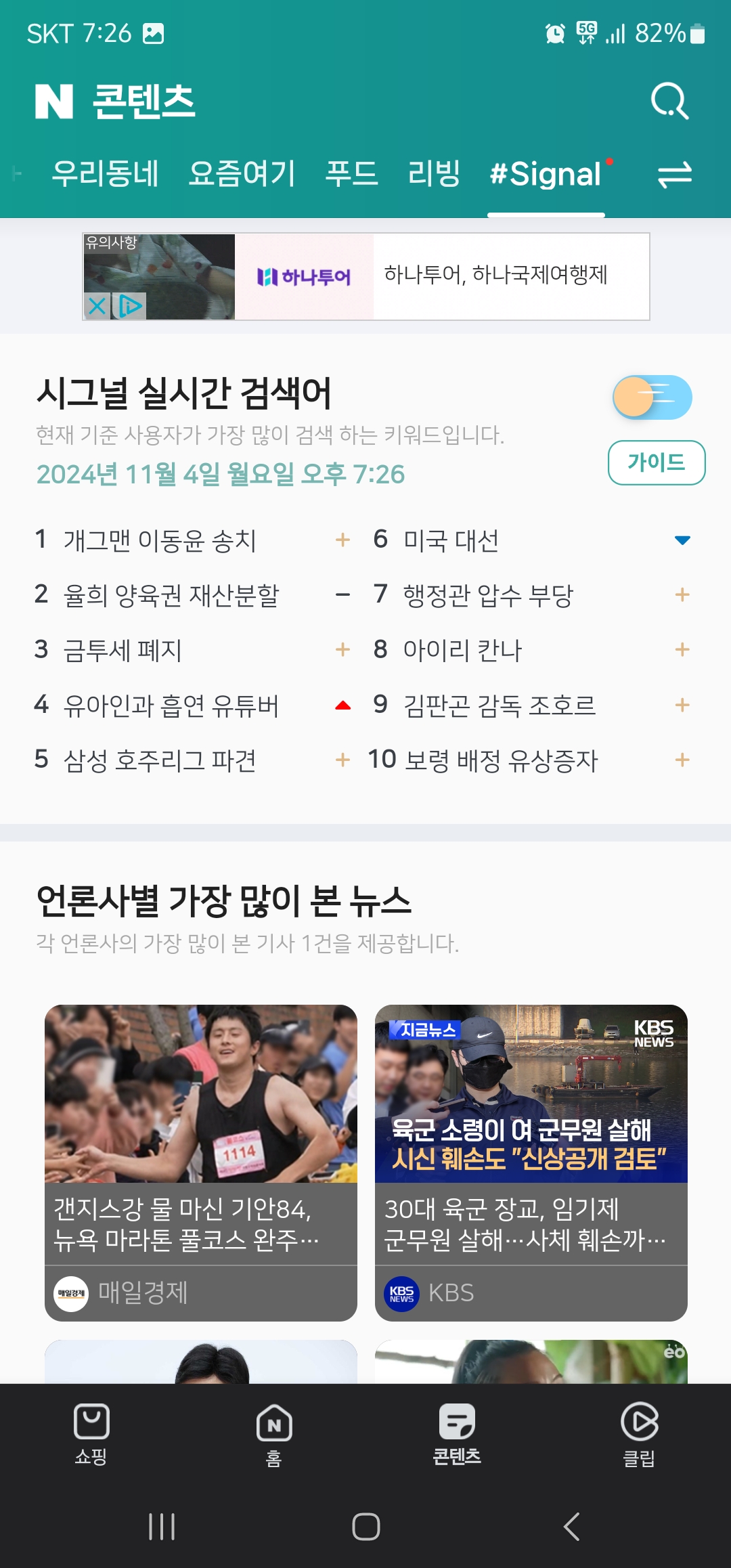 3. 네이버 앱 하단의 “콘텐츠” 탭을 클릭하시고 상단의 “#Signal”을 클릭하시면 네이버 앱에서 실시간 검색어 순위를 확인하실 수 있습니다.